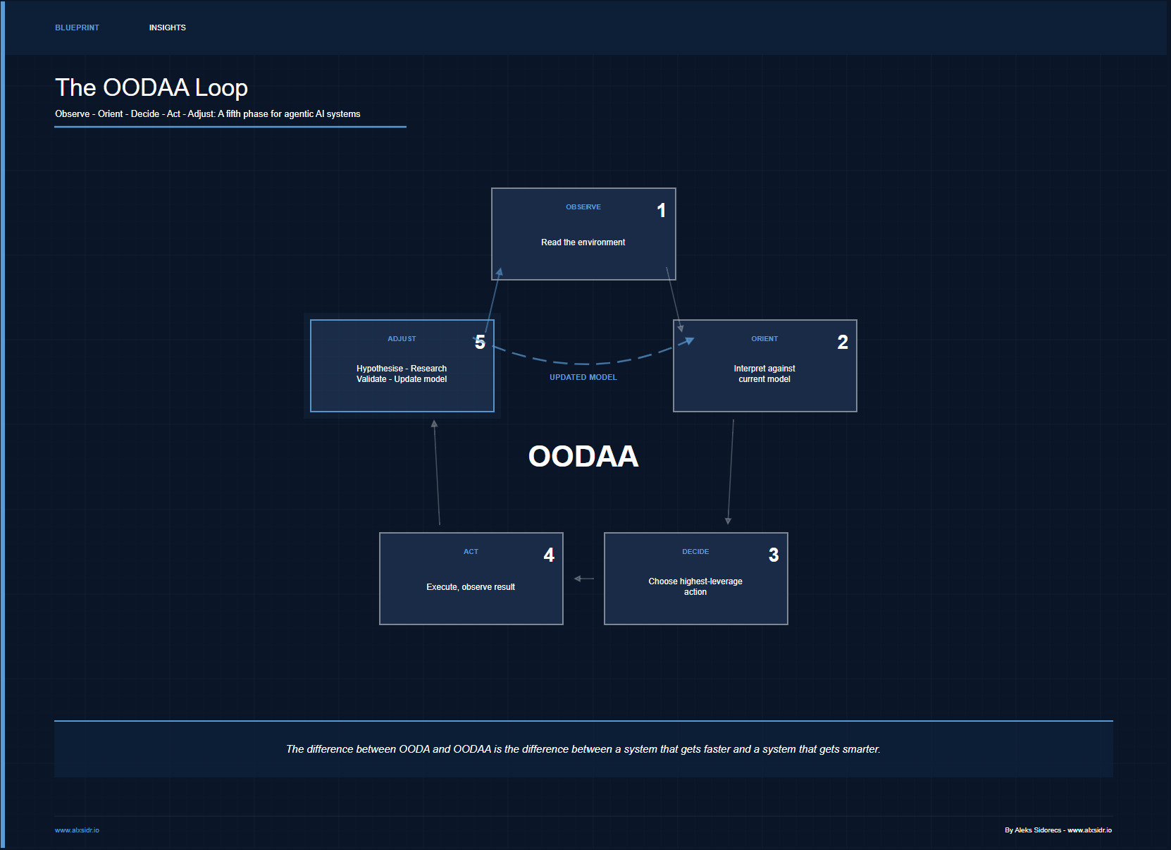 Boyd designed his loop for a single pilot in a single engagement. OODAA is designed for systems that run continuously, learn incrementally, and improve the understanding that drives every decision - not just the speed at which decisions are made.