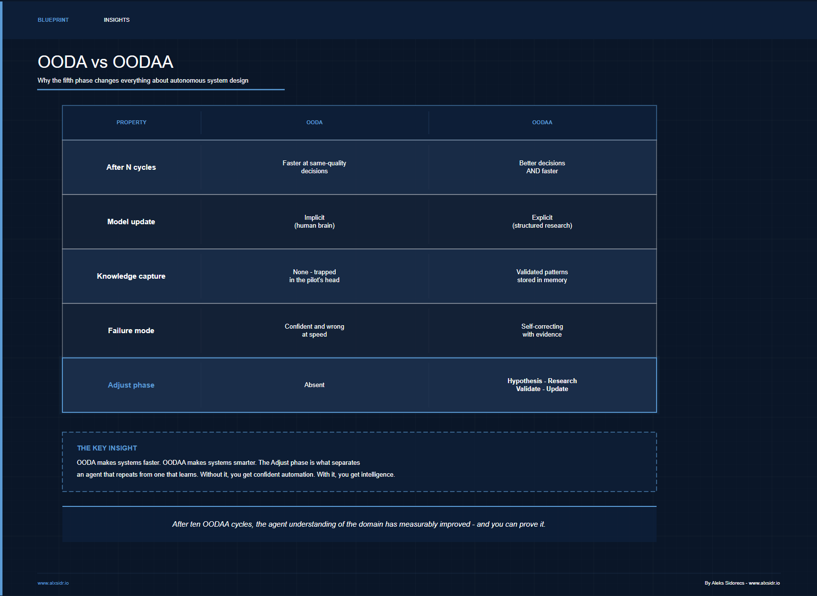 The difference between OODA and OODAA is the difference between a system that gets faster and a system that gets smarter. After ten OODA cycles, you have an agent that makes the same quality decisions more quickly. After ten OODAA cycles, you have an agent whose understanding of the domain has measurably improved - and you can prove it.