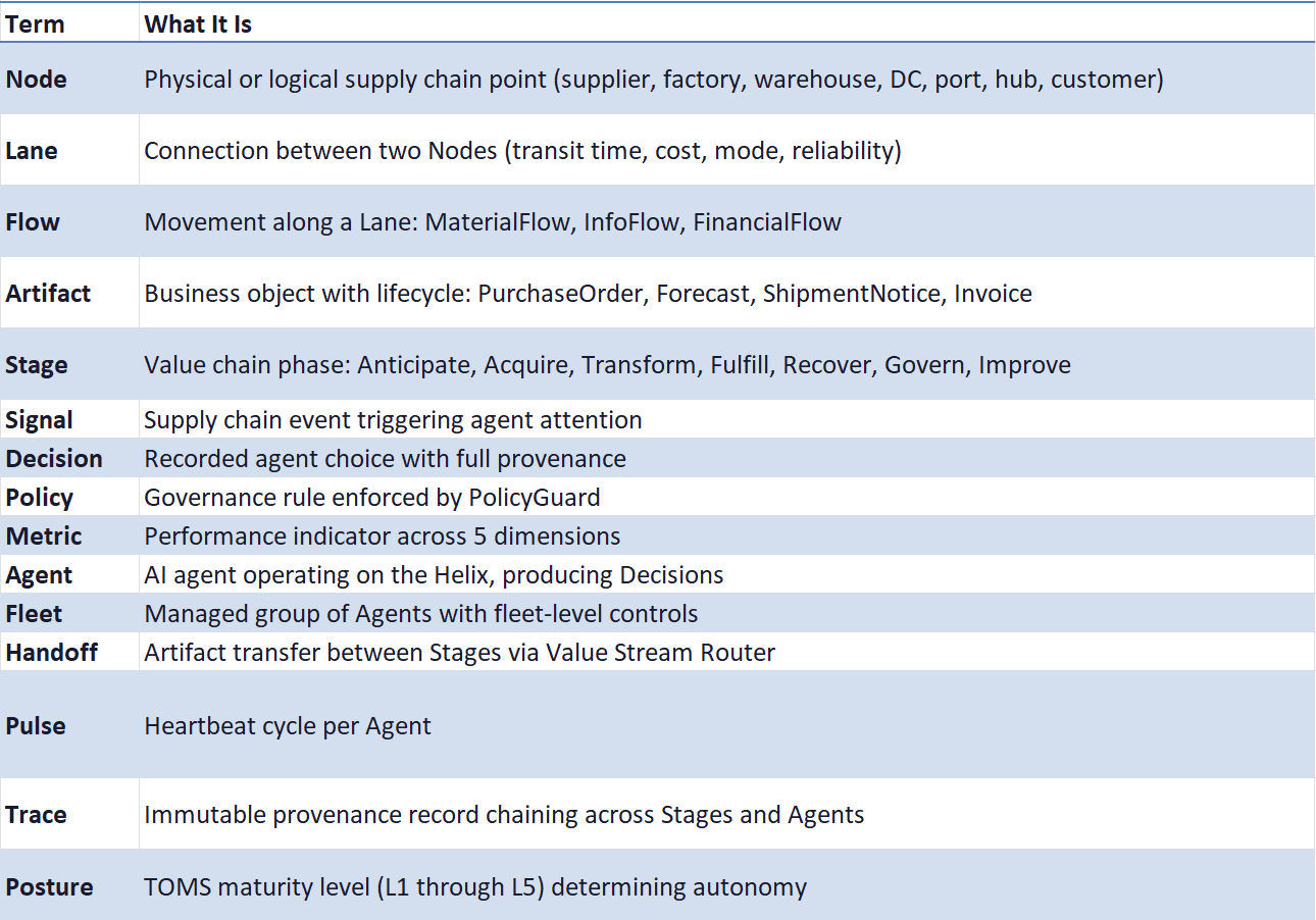Not fifteen terms as documentation overhead. Fifteen terms as load-bearing infrastructure. Every agent, every API endpoint, every piece of configuration uses these terms in exactly the same way.