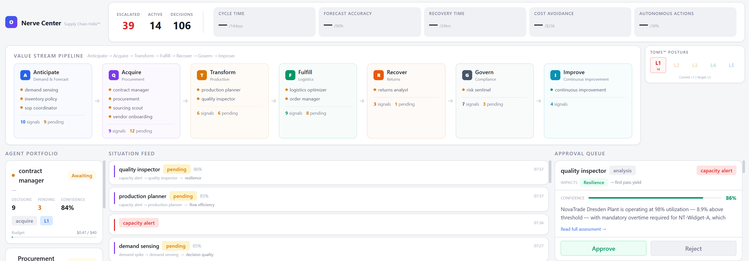 The procurement agent, running its own pulse moments later, sees the demand spike signal in the Helix alongside its own quality hold decision. It knows the context. It recommends "expedite Meridian quality audit; if unresolved within 48 hours, activate Vanguard Materials as secondary source."
