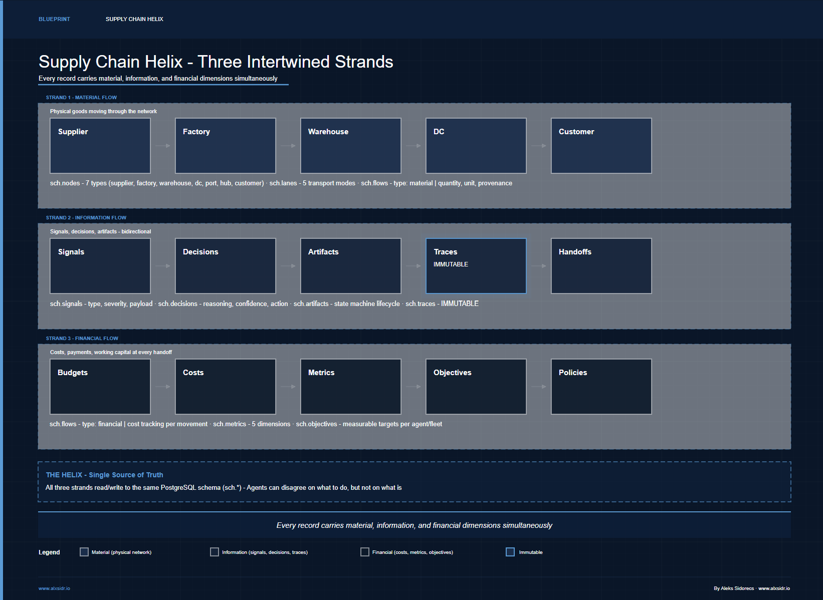 The other open question is cross-strand causality. When a financial flow anomaly should trigger a material flow response through an information flow mechanism - that causal chain crosses all three strands simultaneously. The schema supports it structurally. The agent logic doesn't reason about it yet.