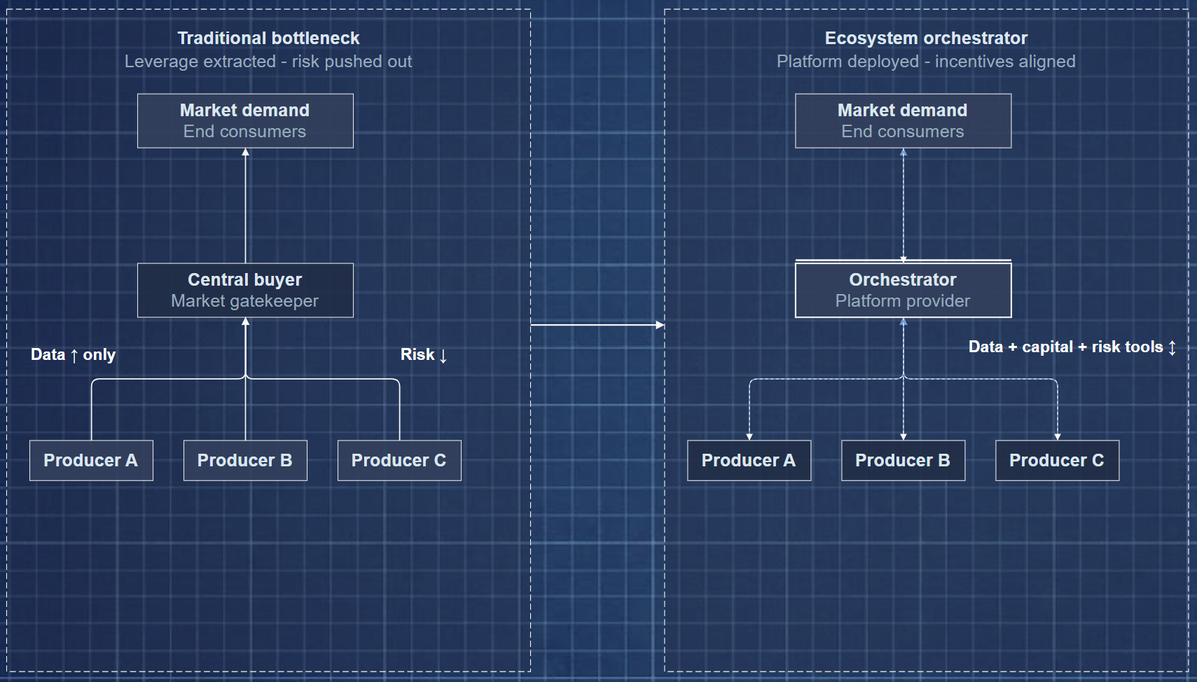 In a traditional symmetric supply chain, data is highly integrated because the players are tightly interdependent. In the asymmetric hourglass, information is naturally stratified by structure. The consolidated middle tier aggregates macro-level intelligence - commodity futures pricing, global demand forecasts, satellite monitoring, predictive modeling - while the fragmented production base holds micro-operational reality: localized conditions, immediate output metrics, ground-level quality signals.