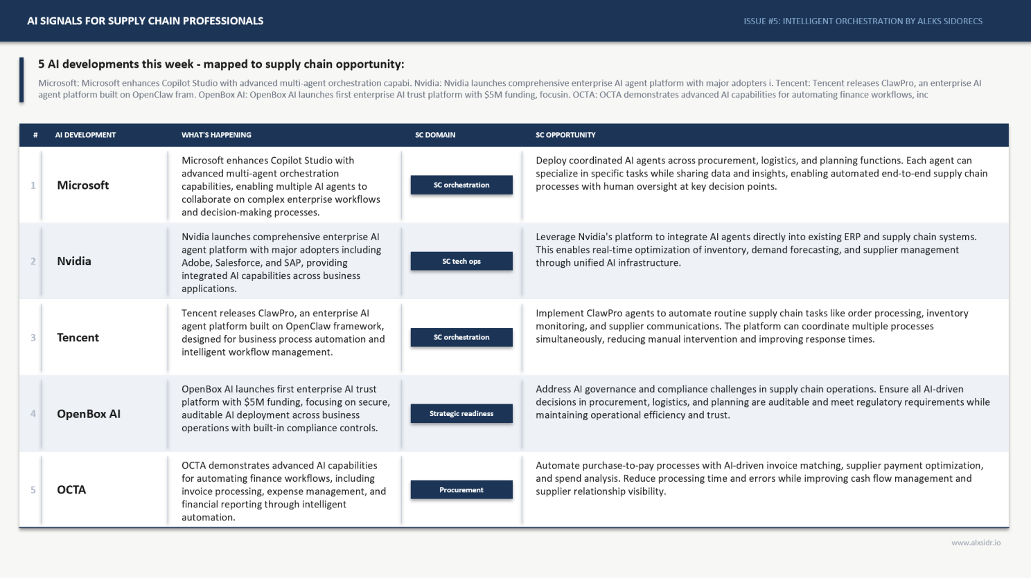 In this feed, NVIDIA deserves a special attention. This matters for supply chain operations because it solves the integration nightmare that has kept AI agents on the sidelines. Most supply chain AI pilots fail not because the algorithms don't work, but because they can't play nicely with existing ERP systems, supplier portals and operational databases.