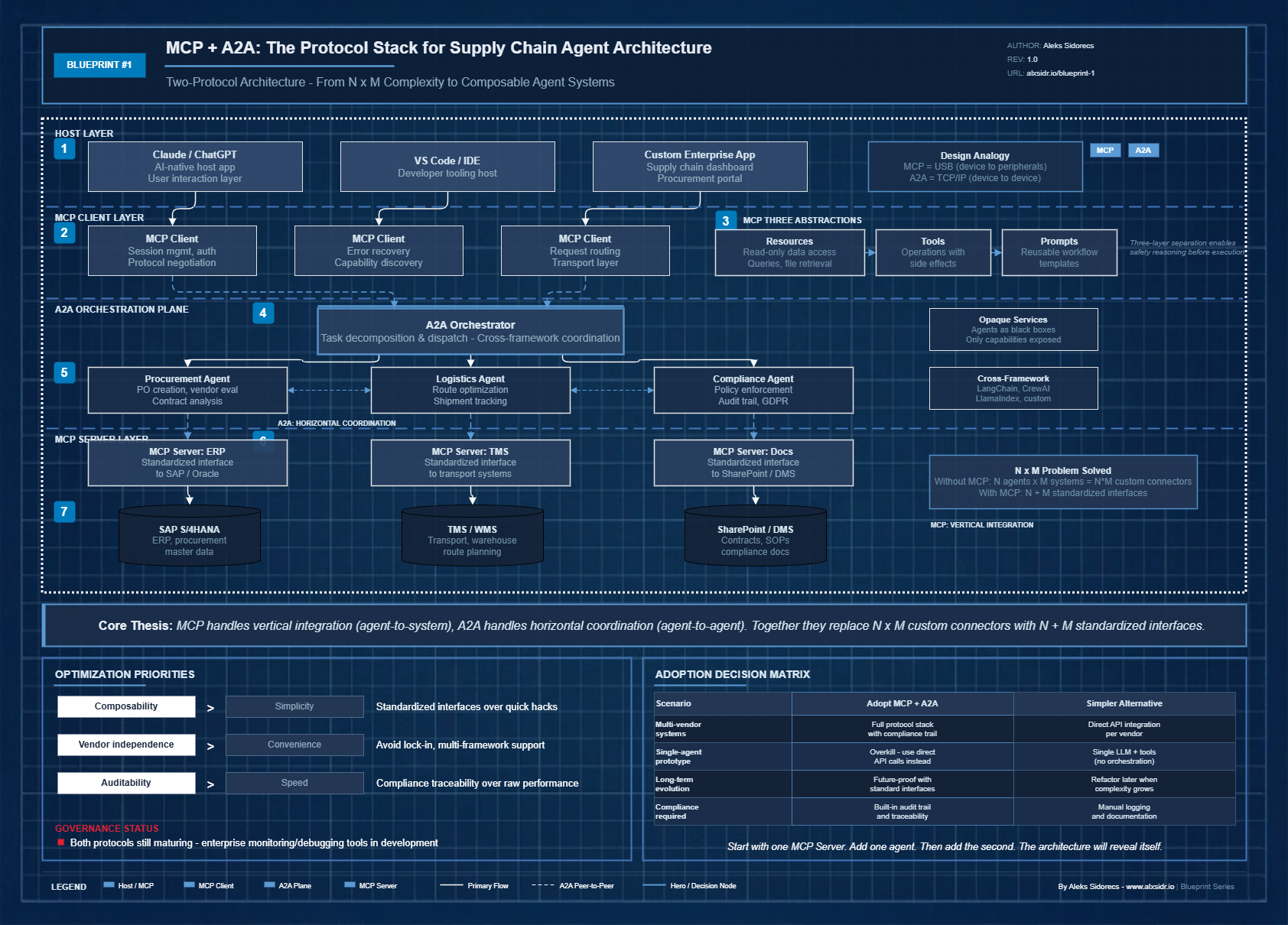 Blueprints Blueprint #1: MCP + A2A - The Emerging Protocol Stack That Will Define Supply Chain Agent Architecture 08 Mar 2026 Blueprint #1: MCP + A2A: The Protocol Stack for Supply Chain Agent Architecture by Aleks Sidorecs